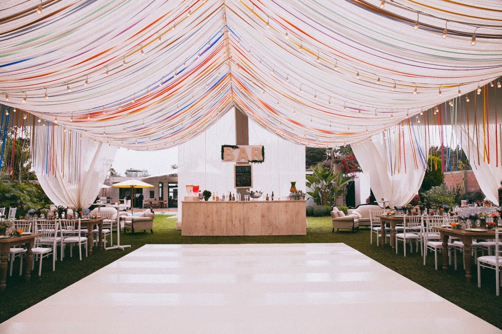 Backyard Company captó rápidamente la idea de Caro y Angel, y desarrollaron el concepto de «Colorful Wedding». Una boda llenecita de color. La decoración tenía ese toldo precioso a 2 aguas que no deja de llamar la atención . De el salen cintas de colores acompañadas por cadenetas de luces (esos foquitos que AMAMOS), para darle calidez al ambiente.