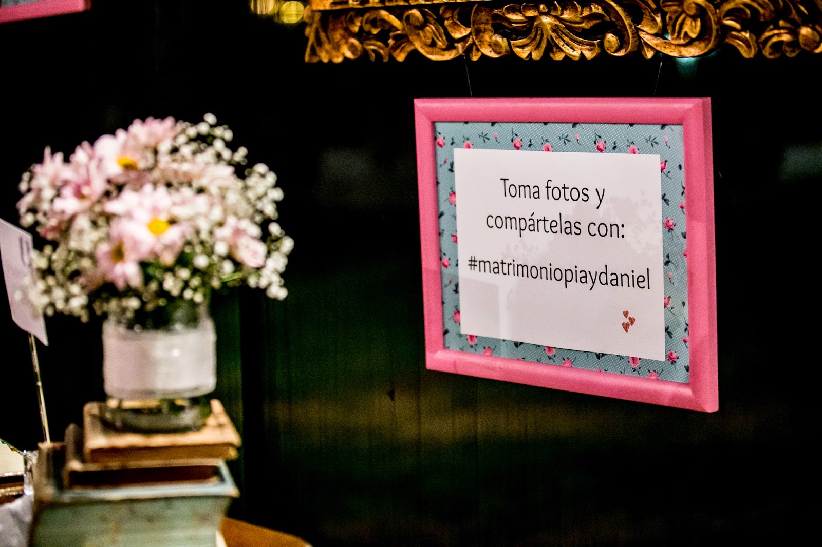 Usamos la misma cajita para recolectar dinero en el Brunch y la misma idea del cartelito impreso y pegado sobre un cuadro que compramos en Casas & Ideas. Ahí le explicábamos a nuestros invitados lo que debían hacer y de paso les contábamos de nuestro hashtag del matrimonio; #matrimoniopiaydaniel